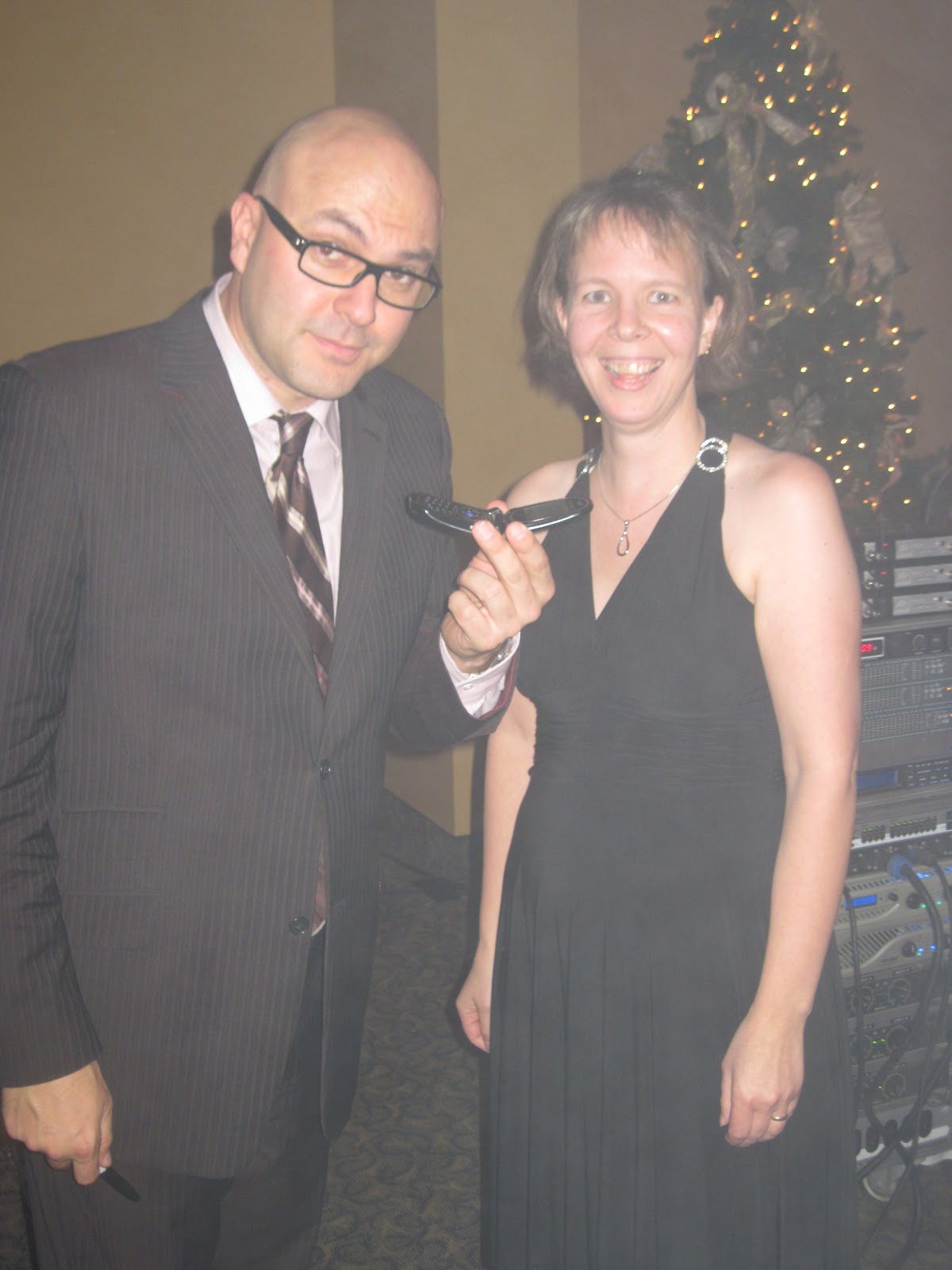 The party was emceed by James Cunningham. And then he did a half hour comedy routine and he was hilarious. At one point he asked, "Who has a Blackberry?" and Blackberry owners cheered. "Who has an iPhone?" And iPhone users cheered. "Who has a flip-phone?" And I cheered so loudly he said, "Hello Amish people!" And later he asked who was from Saskatchewan and I cheered again and he said, "Of course the flip-phone people are from Saskatchewan!" (Disclaimer: The picture of James and I is worse because I knewinstinctively after taking a few bad pictures that in the dark setting, the night setting worked better for taking pictures on our camera. When Dave went to take the picture of us he went, "Oh, it's on night setting" and switched it to portrait setting. Therefore bad picture quality. Oh well. It was either this or the flip-phone picture which James is making fun of in both pictures!)